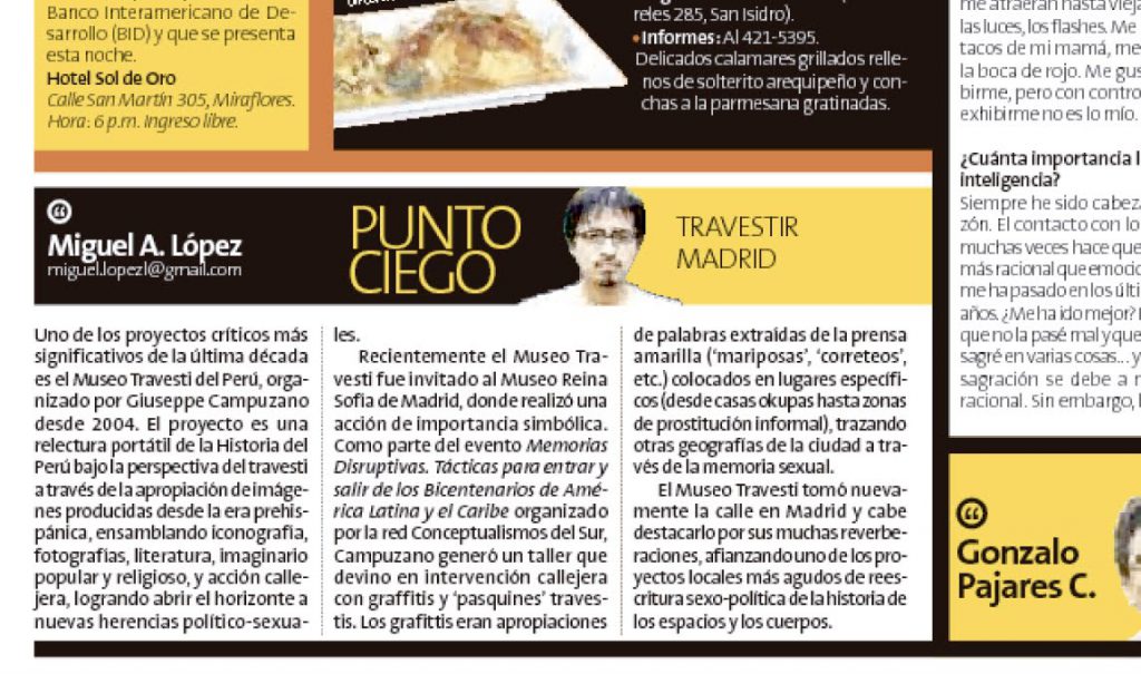 Reproducimos un comentario a propósito de la intervención del Museo Travesti del Perú en el seminario ‘Memorias Disruptivas. Tácticas para entrar y salir de los Bicentenarios de América Latina y el Caribe’, organizada por la Red Conceptualismos del Sur y el MNCARS, en Madrid el 30 de noviembre y 1 de diciembre, en el marco […]