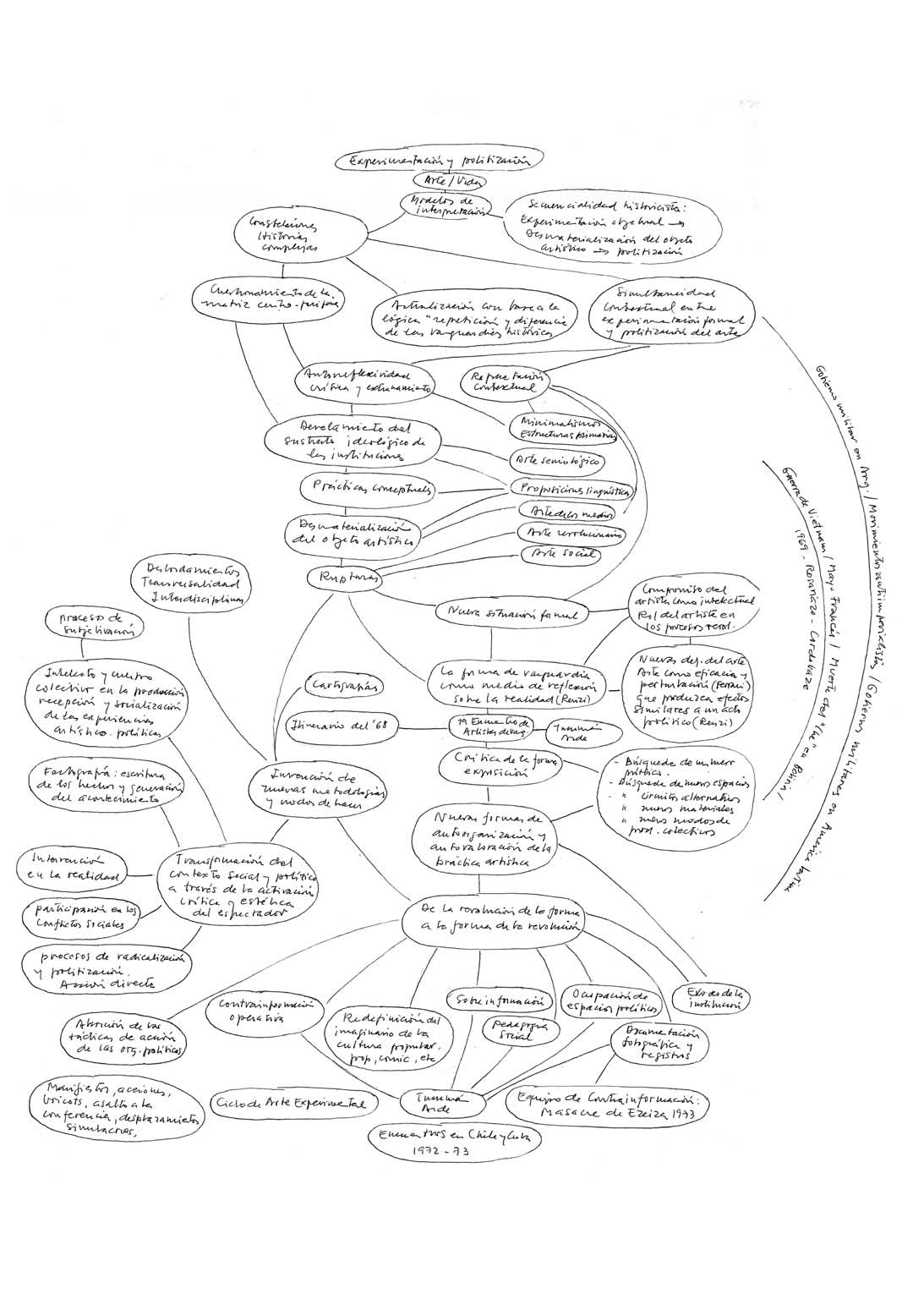 En los sesenta esa redirección de las formas expresivas del arte experimental y de vanguardia hacia la revolución social era una de las opciones viables y una de las derivas posibles de las rupturas que llevaron a intervenir en el campo social. Lo experimental estaba directamente asociado a la vanguardia y el concepto de vanguardia al concepto de revolución. El libro propone que no hay una contradicción ni un corte en ese proceso sino una articulación con el proceso de radicalización y politización en que se debatía la sociedad frente a una realidad polarizada